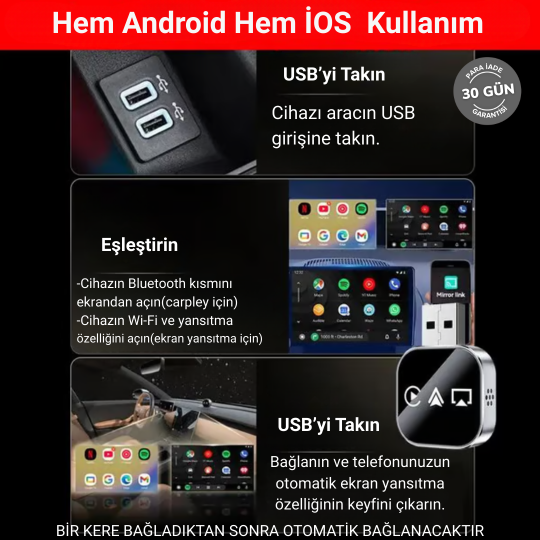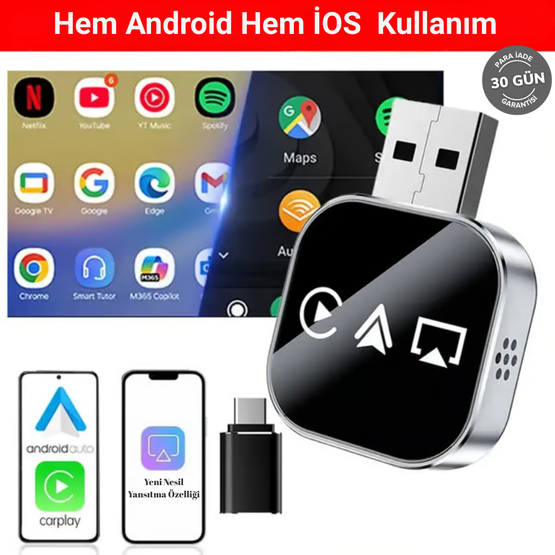 Hayır. Ürün araç ekranına ekstra yük bindirmez ve ekranı ısıtmaz. Orijinal CarPlay ve Android Auto mantığıyla çalışır, araç ekranı için güvenlidir ve uzun süreli kullanıma uygundur.